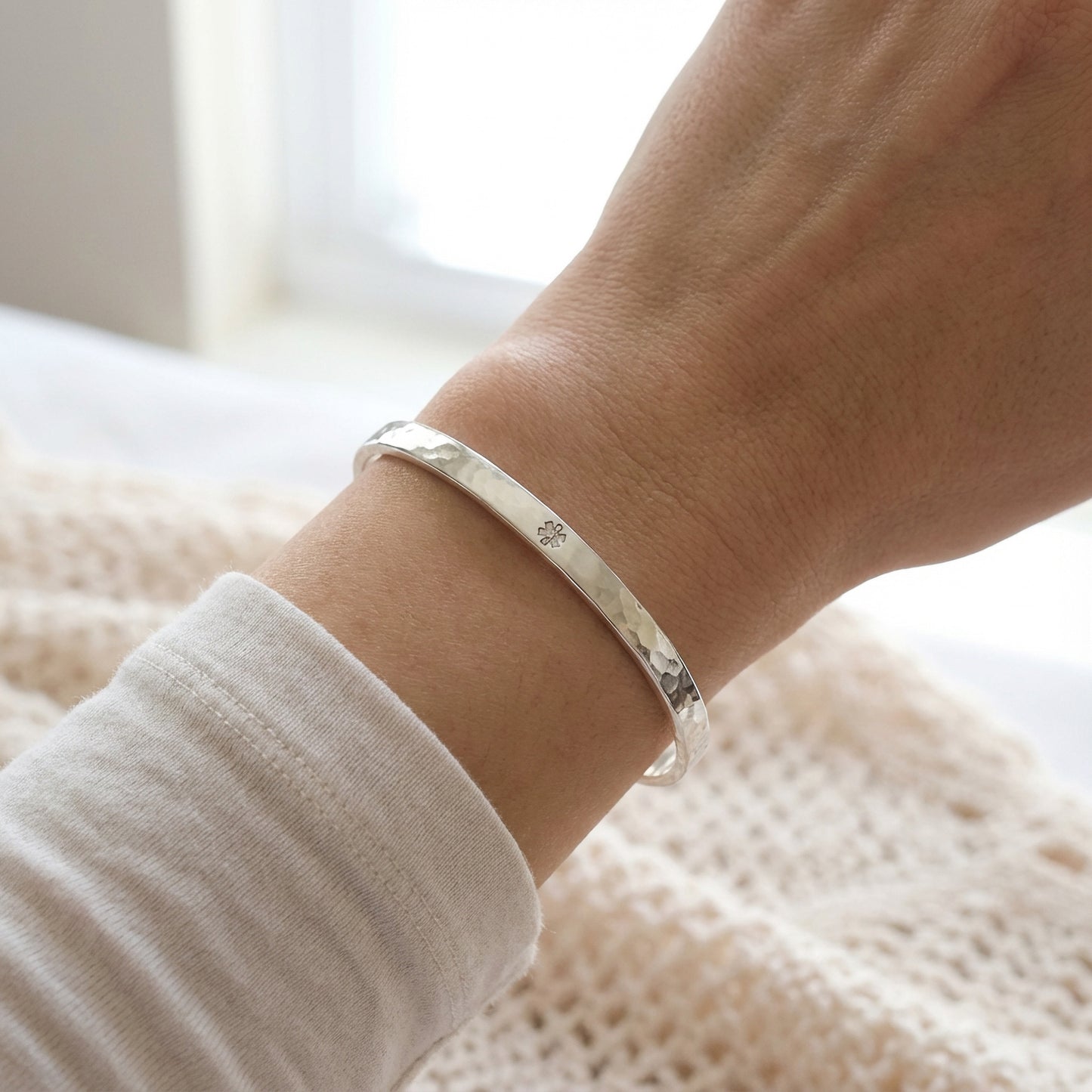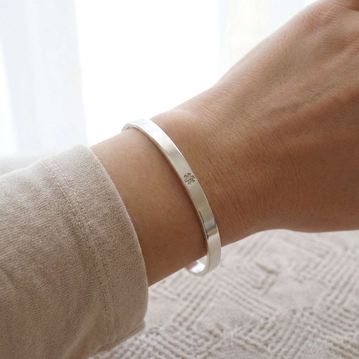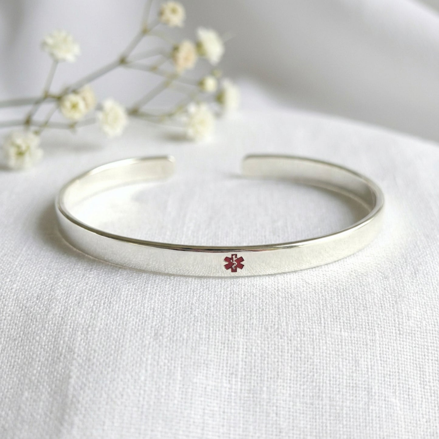 - Hammered or Smooth Sterling Silver cuff bracelet with Medical Alert Symbol outside