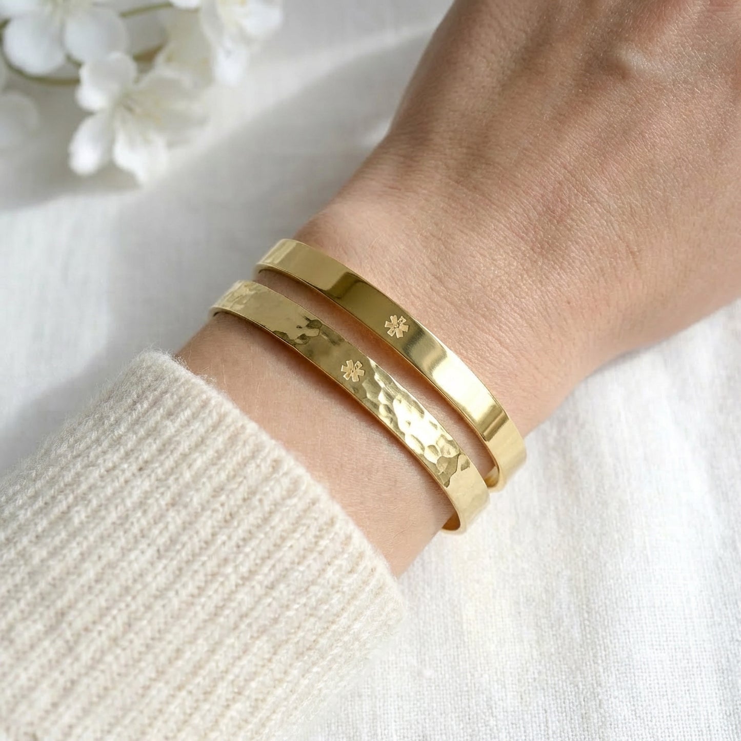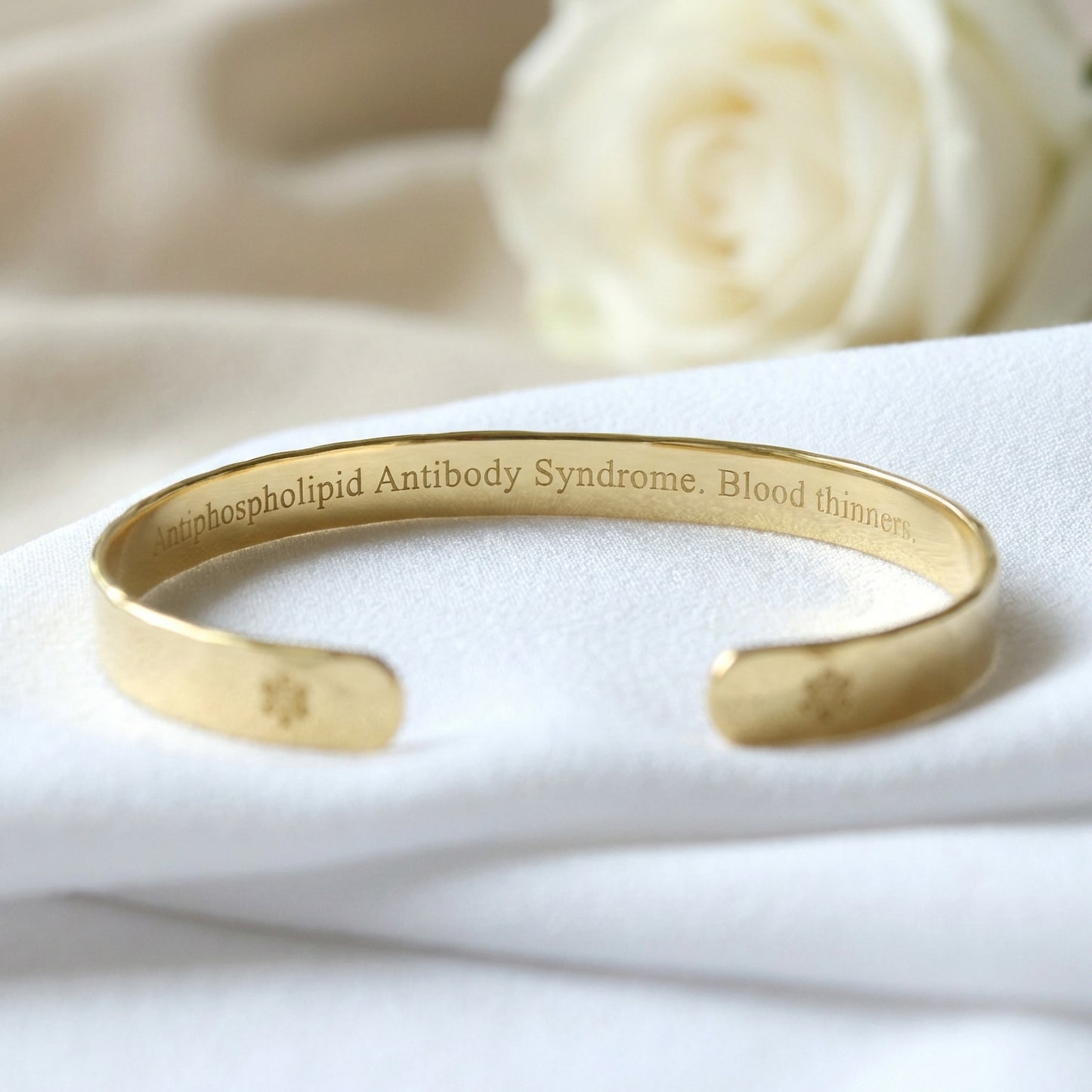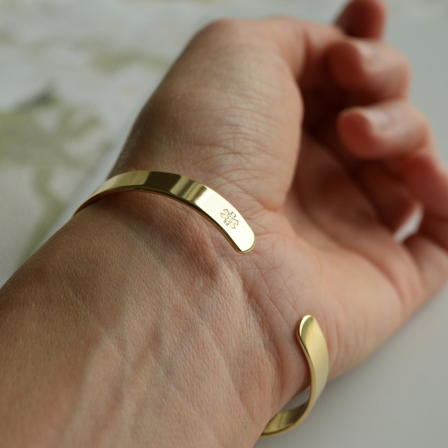 "Gorgeous piece of art." wrote one satisfied customer. This gold plated medical ID bracelet looks just like a piece of jewelry, but it’s still visible and functional.