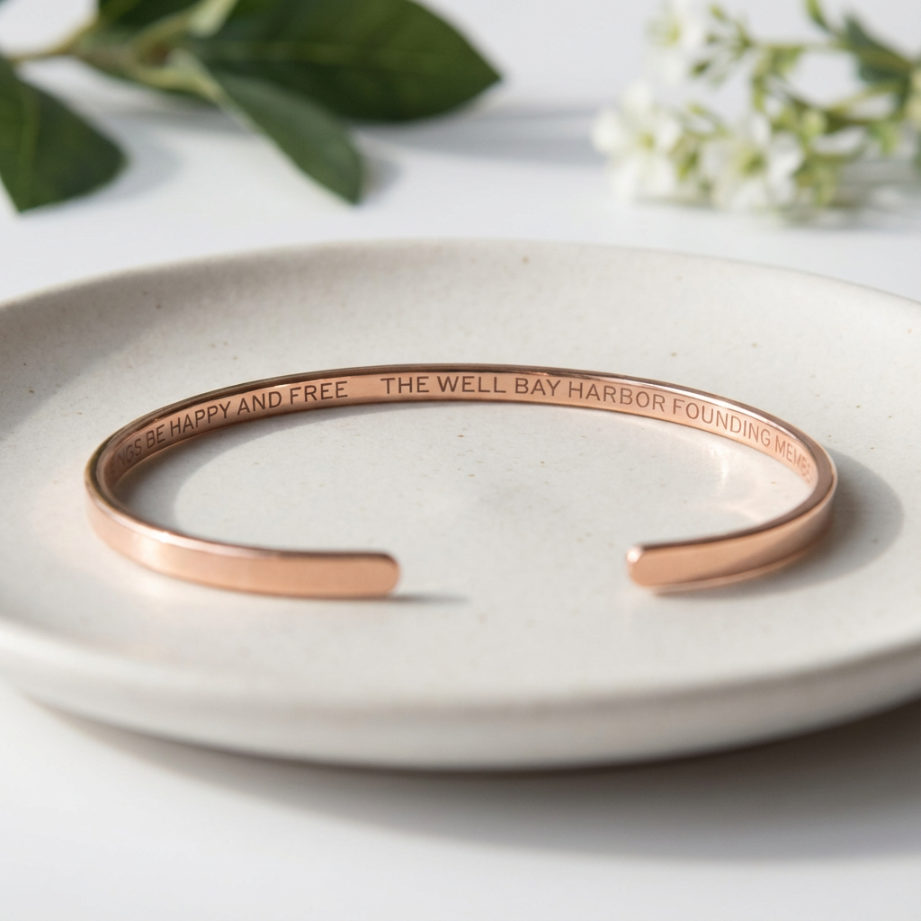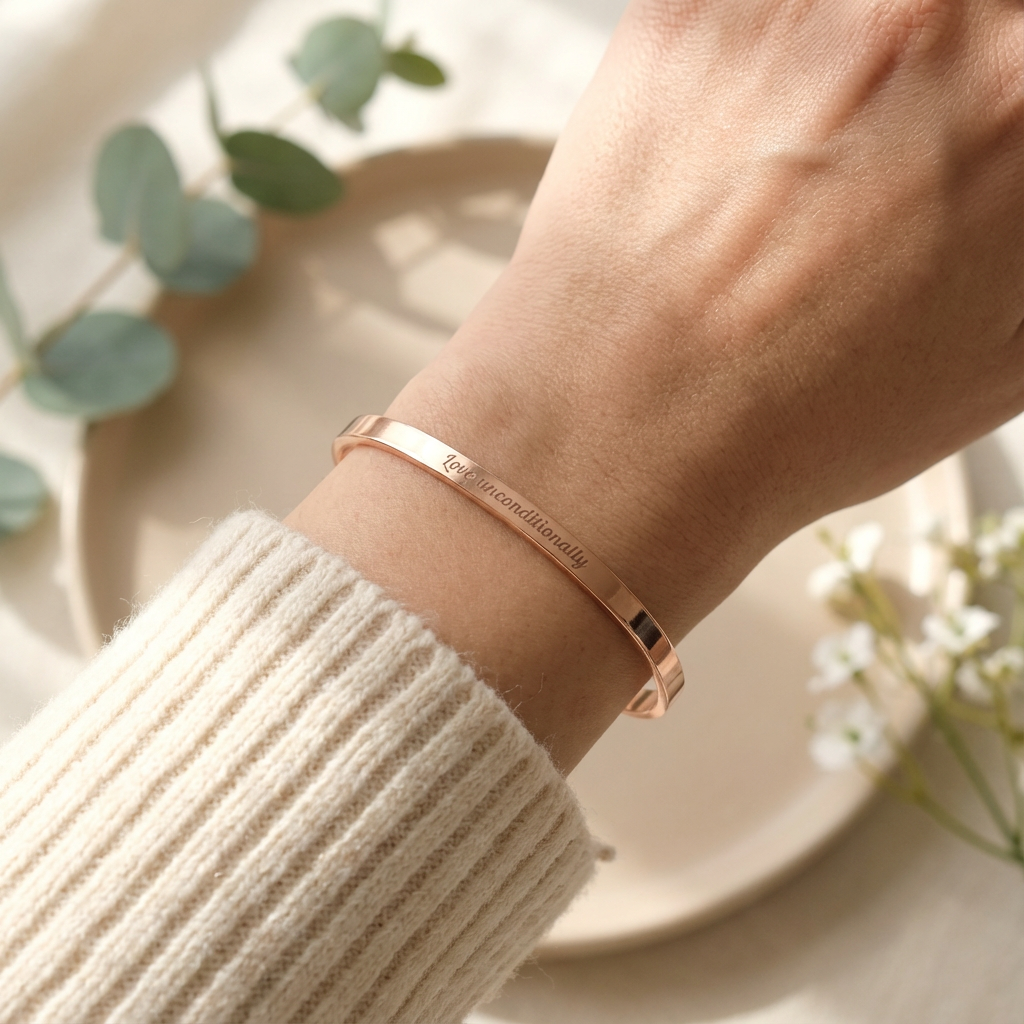 A slim copper cuff bracelet engraved with your personal mantra – a simple everyday reminder you can carry on your wrist.