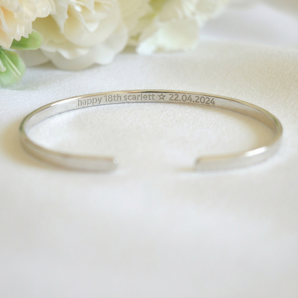 Custom Engraved Sterling Silver Cuff Bracelet - 3mm Narrow Band, Birthday Gift
