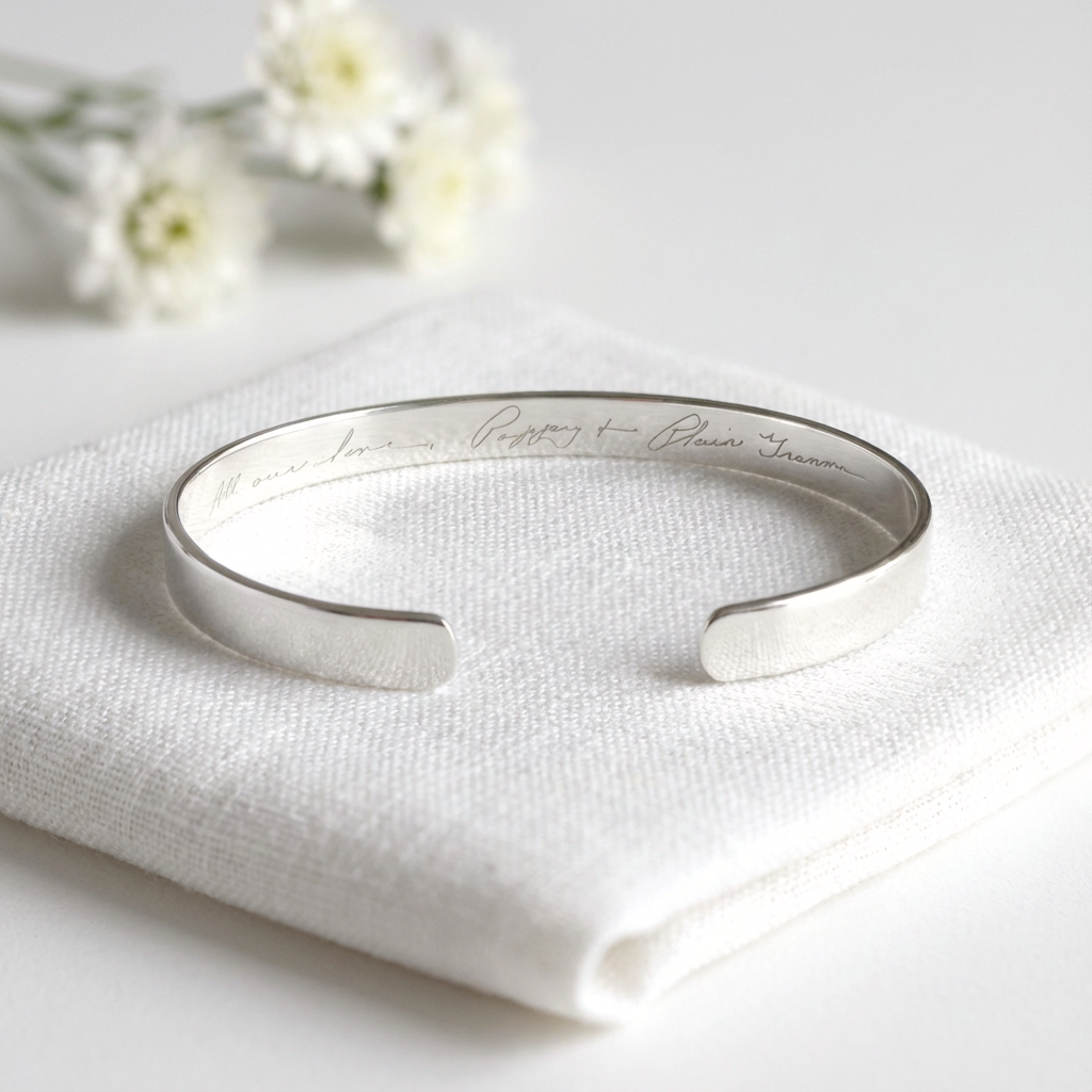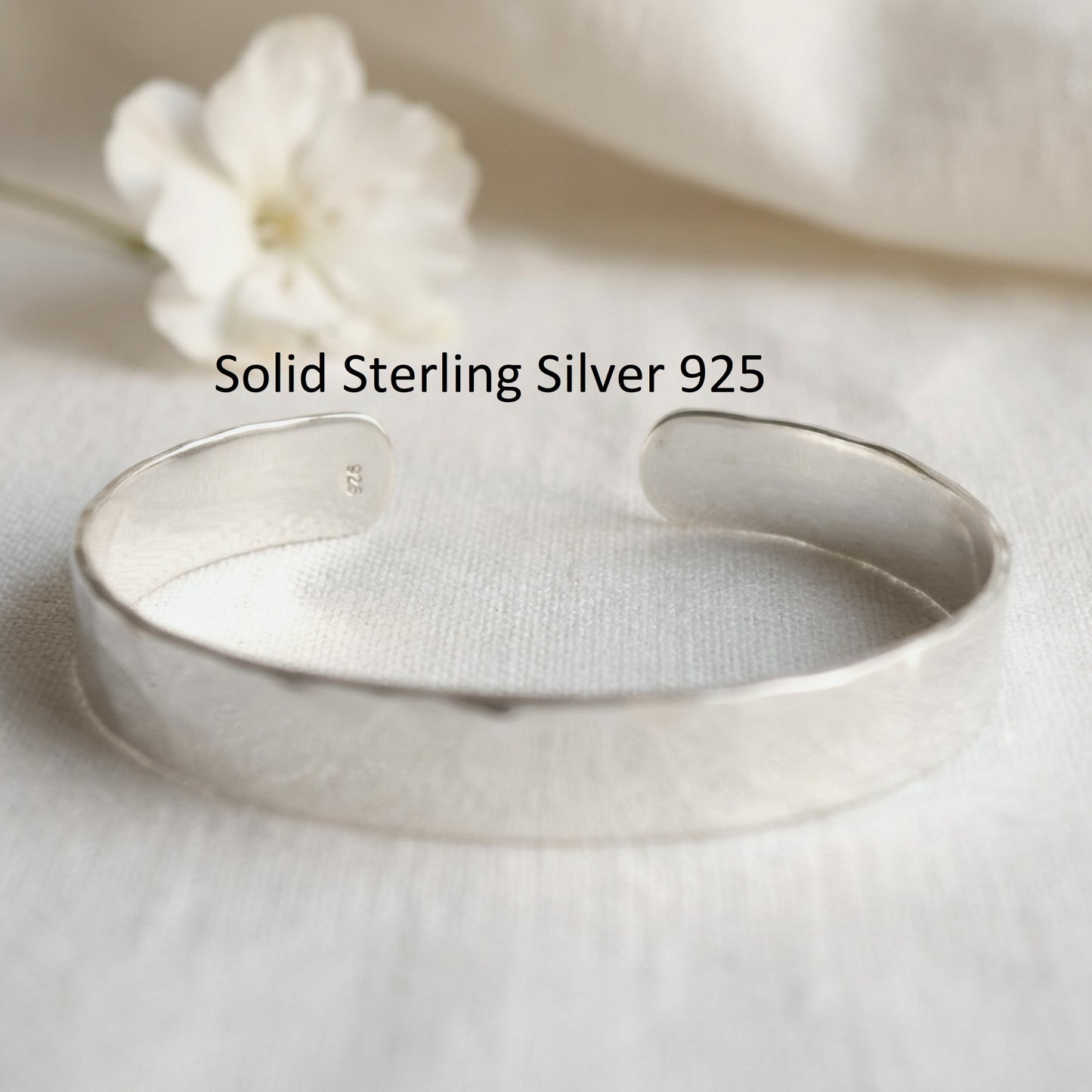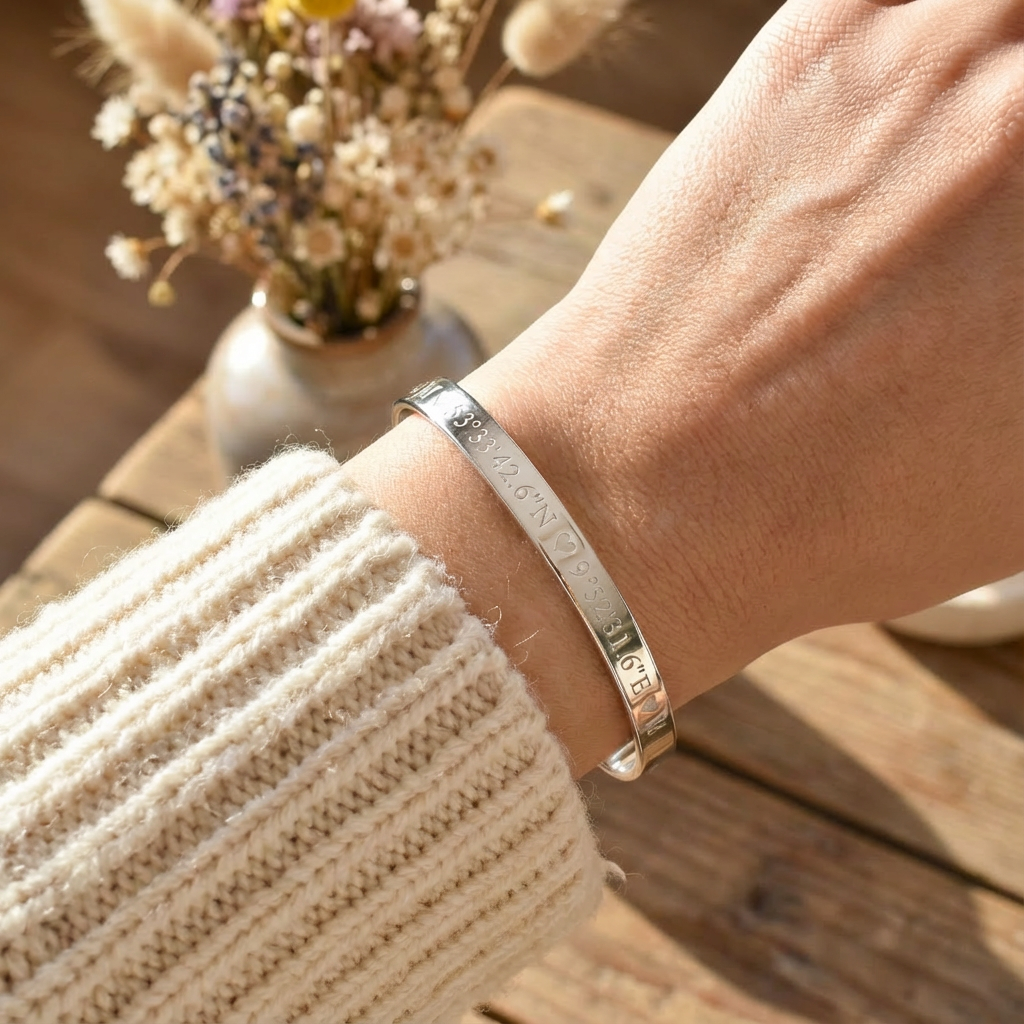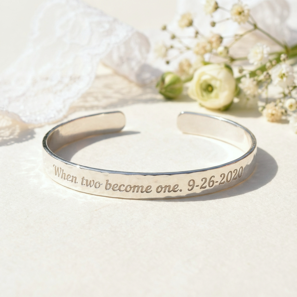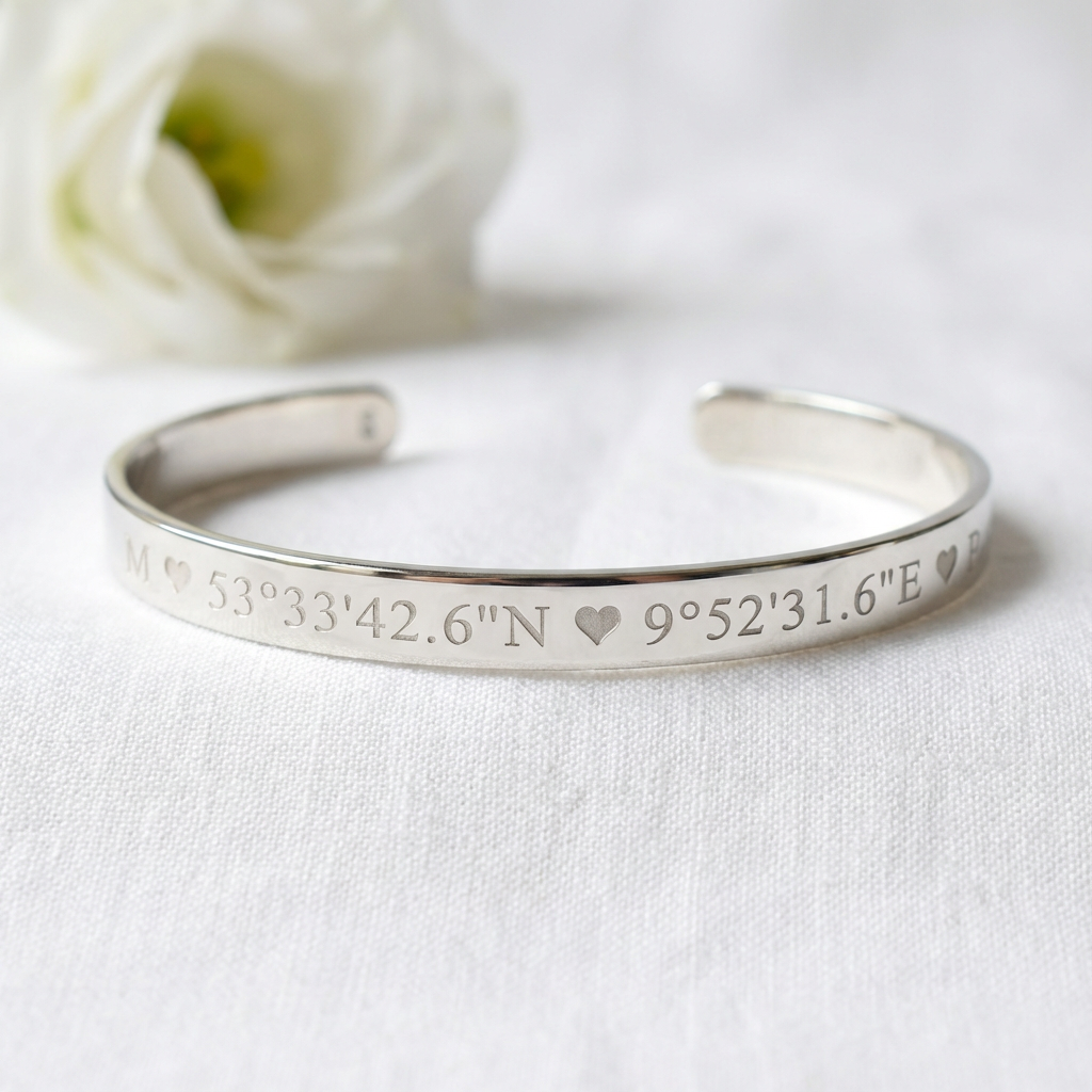 This personalized Sterling Silver 925 bracelet is a meaningful symbol of love and affection designed to be treasured for years to come. Engraved with your chosen words, this elegant cuff bracelet makes a thoughtful gift for a birthday, anniversary, or any special occasion, creating a lasting reminder of love and connection.